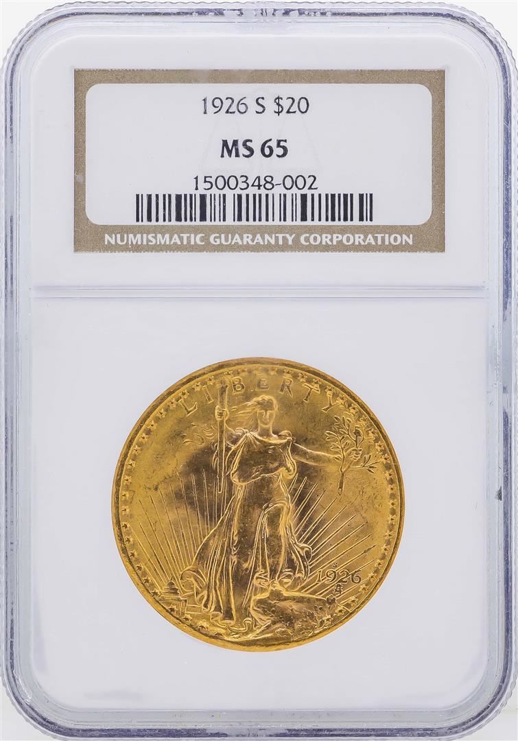One 1926-S $20 St. Gaudens Double Eagle Gold Coin NGC MS65. PCGS price guide $22,500 a very rare and elusive Saint Gaudens date. NGC Certified.