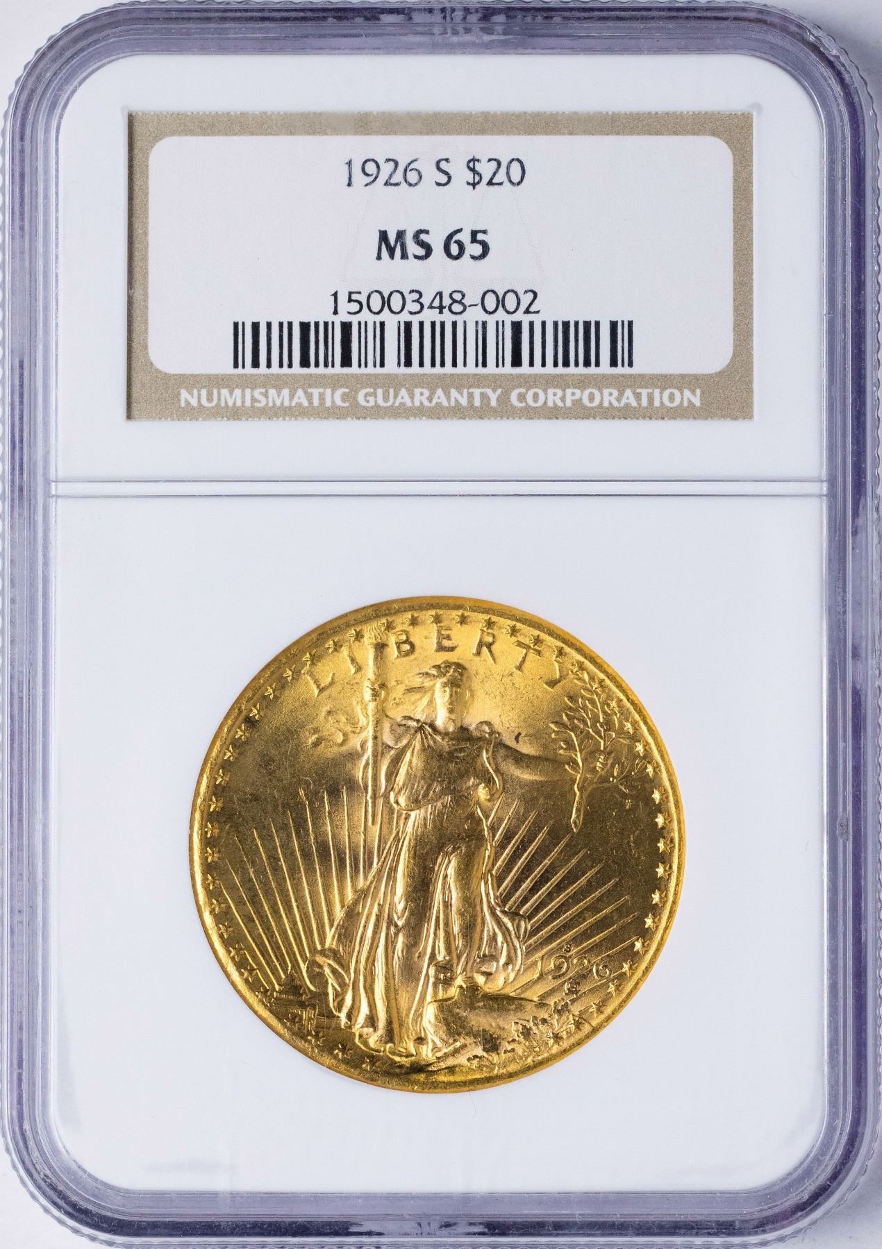 One 1926-S $20 St. Gaudens Double Eagle Gold Coin NGC Graded MS65. This splendid Gem exhibits frosty and brilliant yellow-gold surfaces with bold design motifs. Despite the mintage of more than 2 million coins, the 1926-S is scarce in all grades, and rare in Gem or finer grades. Specialists in the Saint-Gaudens series are well aware of the gold melting’s that occurred in the late 1930s after gold coinage was recalled earlier in that decade. Unlike Philadelphia issues that were exported prior to the depression, most branch mint issues remained in domestic hands. While the certified survival rate of 1926 P-Mint double eagles is about one in 17, the rate for D and S-Mint examples that year is one in 1,400.
