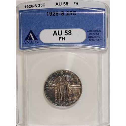 <B>1926-S 25C AU58 Full Head ANACS.</B></I> This is a rather deeply toned example that is boldly struck and shows some smoothness on the head and the eagle's breast from circulation wear. Uneven layers of turquoise, purple, and golden-brown coloration occur on both sides. Surface marks are minor. <BR><BR><B>Coin Engraver:</B> Hermon A. MacNeil<BR><BR><b>Shipping:</b> Coins & Currency (<a target="_blank" href="http://www.heritageauctions.com/common/shipping.php">view shipping information</a>)