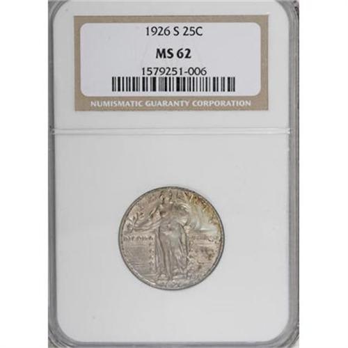 <B>1926-S 25C MS62 NGC.</B></I> NGC Census: (25/150). PCGS Population (21/235). Mintage: 2,700,000. Numismedia Wsl. Price for NGC/PCGS coin in MS62: $450. (#5758)<BR><BR><B>Coin Engraver:</B> Hermon A. MacNeil<BR><BR><b>Shipping:</b> Coins & Currency (<a target="_blank" href="http://www.heritageauctions.com/common/shipping.php">view shipping information</a>)