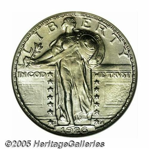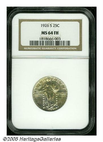 <B>1926-S<25C> MS64 Full Head NGC.</B></I> Cline (1986) states that the 1926-S, when one is fortunate enough to find an example at the finer Full Head grade levels, comes "flashy with lots of eye appeal." This is just such a coin, and the eye appeal alone has the look of a full Gem designation. There is no toning save for the lightest suggestion of champagne tinting on the obverse, and the surfaces are free of all but one or two wispy abrasions. The obverse is particularly smooth, but both sides are equally lustrous with a full, satiny sheen. Population: 8 in 64, 17 finer (5/05).