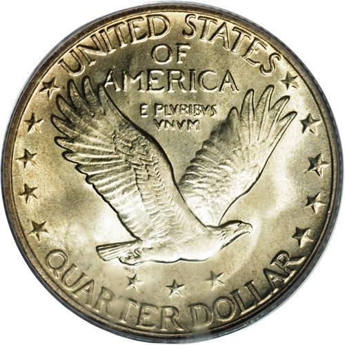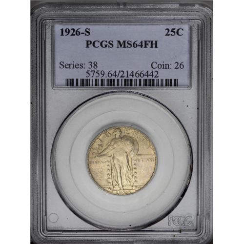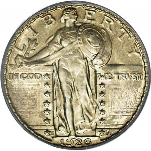 <B>1926-S<25C> MS64 Full Head PCGS.</B></I> J.H. Cline writes in his <I>Standing Liberty Quarters</B></I> book writes that 1% or less of 1926-S quarters are struck with full heads. The sharply impressed Full Head specimen offered in this lot reveals some weakness in a couple of rivets near Liberty's body; the remaining design features are nicely defined. Lustrous surfaces are bathed in a thin veneer of light champagne-gold color with some violet accents. A few minute marks on the Liberty motif define the grade. Population: 19 in 64, 22 finer (3/06).
