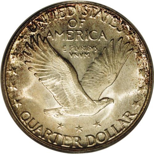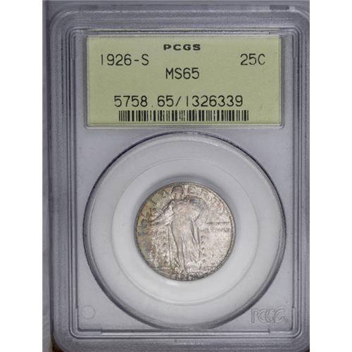 <B>1926-S 25C MS65 PCGS.</B></I> A scarce date that is always in strong demand in Gem grades, and the present offering boasts lovely peripheral iridescent toning on the obverse. Flashy luster in the fields is framed by tiny golden specks on the reverse. Liberty's head shows partial definition, including the leaves on her head, but has softness around her ear. Housed in an older green insert PCGS holder.