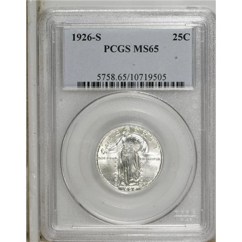 <B>1926-S 25C MS65 PCGS.</B></I> Outstanding brilliance emanates from both sides of this immaculately preserved Gem. The usual weakness on the central devices prevents an even higher grade. Population: 58 in 65, 12 finer (1/07).<BR><BR><b>Shipping:</b> Coins & Currency (<a target="_blank" href="http://www.heritageauctions.com/common/shipping.php">view shipping information</a>)