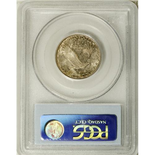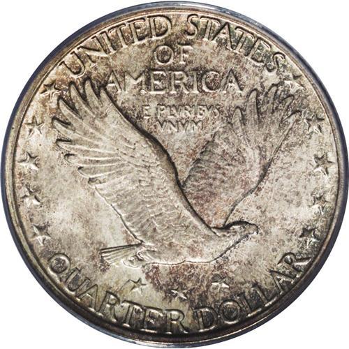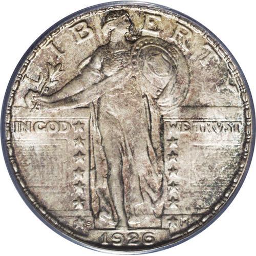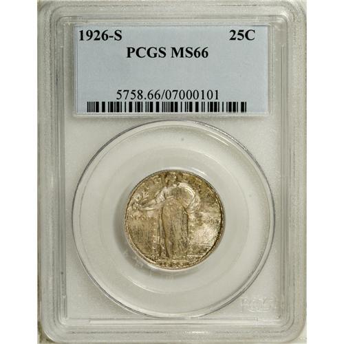 <B>1926-S 25C MS66 PCGS.</B></I> The 1926-S in Gem Full Head condition is a "much underrated coin" according to Standing Liberty pundit J.H. Cline, among the rarest save for the 1920-S and 1926-D in Full Head. The San Francisco Mint had trouble striking up most coins in the 1920s to the standards of Denver and Philadelphia. This coin lacks full head details, but it is remarkably pristine and attractive. The obverse boasts deep lilac-rose patina, with the reverse more delicately tinted from the same palette. Three leaf sprigs radiate above Liberty's head, but some flatness at the ear removes Full Head consideration. Good luster and excellent eye appeal complete the package. Some diagonal die polishing striations are noted in the area of LIB on the obverse. One of the dozen finest certified at PCGS, with an added 10 Full Head pieces (10/06).<BR><BR><b>Shipping:</b> Coin/Currency (<a target="_blank" href="http://www.heritageauctions.com/common/shipping.php">view shipping information</a>)