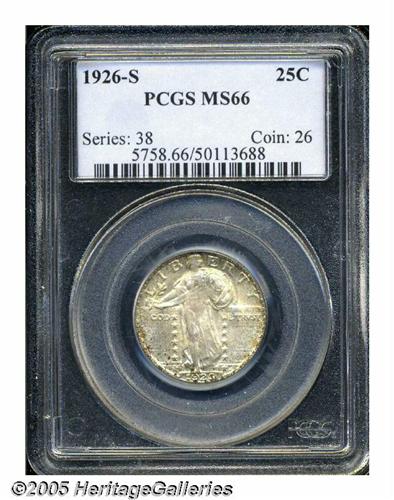 <B>1926-S<25C> MS66 PCGS.</B></I> Thick, satiny luster rolls across both sides and is draped in milky silver-gray and speckled russet toning. What this scarcer S-mint lacks in strike, it more than makes up for in originality and surface preservation. Population: 12 in 66, 0 finer (5/05).