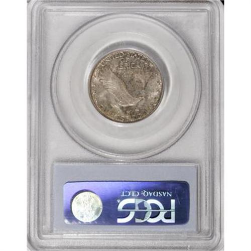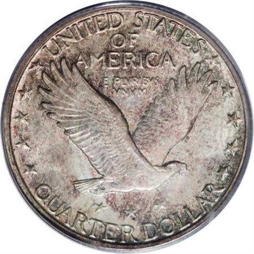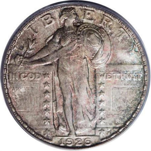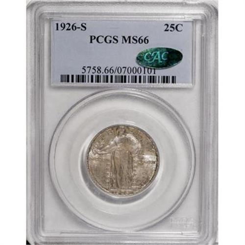 <B>1926-S 25C MS66 PCGS. CAC.</B></I> The 1926-S in Gem Full Head condition is a "much underrated coin" according to Standing Liberty expert J.H. Cline, and among the rarest save for the 1920-S and 1926-D in Full Head. The San Francisco Mint had trouble striking up most coins in the 1920s to the standards of Denver and Philadelphia. This coin lacks full head details, but it is remarkably pristine and attractive. The obverse boasts speckled lilac-rose and turquoise patina, with the reverse more delicately tinted from the same palette. Three leaf sprigs radiate above Liberty's head, but some flatness at the ear removes Full Head consideration. Good luster and excellent eye appeal complete the package. Some diagonal die polishing striations are noted in the area of LIB on the obverse. <BR><I>From The Hoffy Collection, NGC's #3 Registry Collection of Standing Liberty Quarters.</B></I><BR><BR><B>Coin Engraver:</B> Hermon A. MacNeil<BR><BR><b>Shipping:</b> Coins & Currency (<a target="_blank" href="http://www.heritageauctions.com/common/shipping.php">view shipping information</a>)