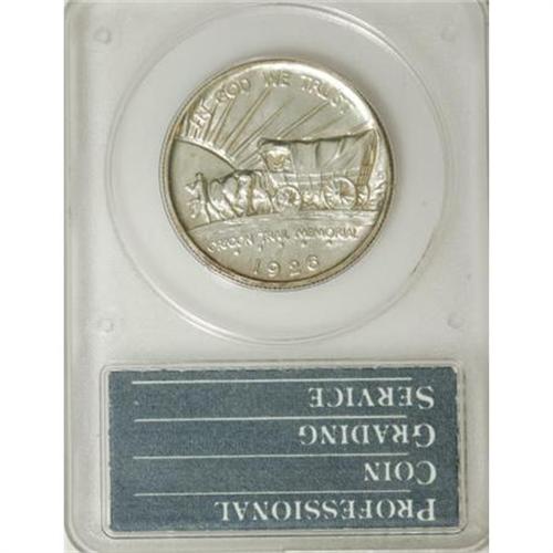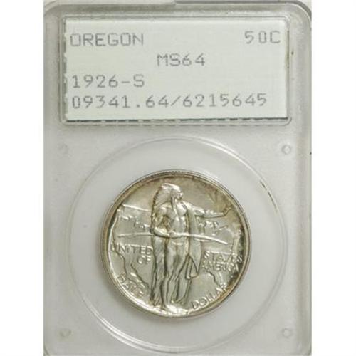 <B>1926-S 50C Oregon MS64 PCGS.</B></I> PCGS Population (1237/1245). NGC Census: (644/1444). Mintage: 83,055. Numismedia Wsl. Price for NGC/PCGS coin in MS64: $160. (#9341)<BR><BR><b>Shipping:</b> Coins & Currency (<a target="_blank" href="http://www.heritageauctions.com/common/shipping.php">view shipping information</a>\)