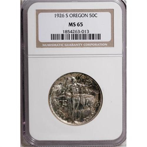 <B>1926-S 50C Oregon MS65 NGC.</B></I> NGC Census: (805/637). PCGS Population (840/404). Mintage: 83,055. Numismedia Wsl. Price for NGC/PCGS coin in MS65: $268. (#9341)<BR><I>From The Frank DuVall Collection of U.S. Commemoratives.</B></I><BR><BR><b>Shipping:</b> Coins & Currency (<a target="_blank" href="http://www.heritageauctions.com/common/shipping.php">view shipping information</a>\)
