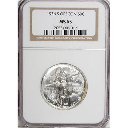 <B>1926-S 50C Oregon MS65 NGC.</B></I> NGC Census: (808/639). PCGS Population (847/405). Mintage: 83,055. Numismedia Wsl. Price for NGC/PCGS coin in MS65: $268. (#9341)<BR><BR><b>Shipping:</b> Coins & Currency (<a target="_blank" href="http://www.heritageauctions.com/common/shipping.php">view shipping information</a>)