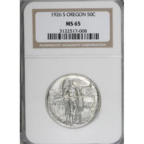 <B>1926-S 50C Oregon MS65 NGC.</B></I> NGC Census: (819/652). PCGS Population (854/417). Mintage: 83,055. Numismedia Wsl. Price for NGC/PCGS coin in MS65: $268. (#9341)<BR><BR><b>Shipping:</b> Coins & Currency (<a target="_blank" href="http://www.heritageauctions.com/common/shipping.php">view shipping information</a>)