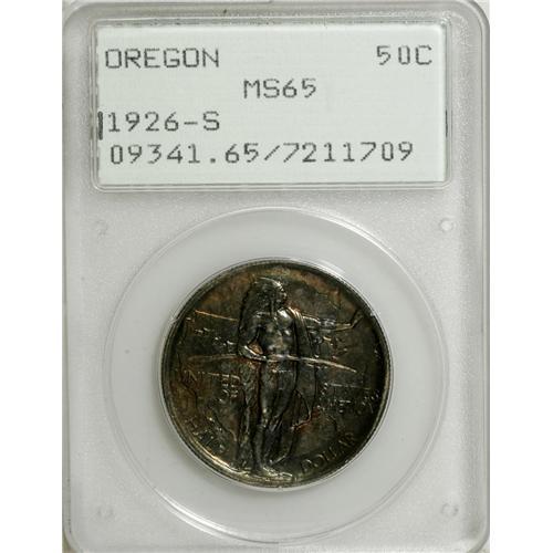 <B>1926-S 50C Oregon MS65 PCGS.</B></I> PCGS Population (841/405). NGC Census: (798/630). Mintage: 83,055. Numismedia Wsl. Price for NGC/PCGS coin in MS65: $268. (#9341)<BR><BR><b>Shipping:</b> Coins & Currency (<a target="_blank" href="http://www.heritageauctions.com/common/shipping.php">view shipping information</a>)