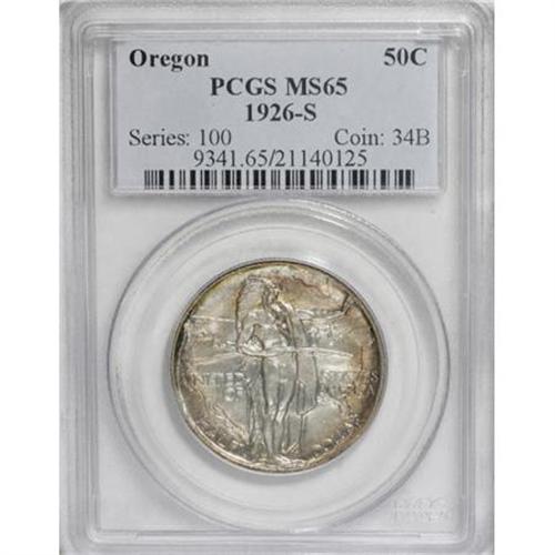<B>1926-S 50C Oregon MS65 PCGS.</B></I> PCGS Population (840/404). NGC Census: (802/631). Mintage: 83,055. Numismedia Wsl. Price for NGC/PCGS coin in MS65: $268. (#9341)<BR><BR><b>Shipping:</b> Coins & Currency (<a target="_blank" href="http://www.heritageauctions.com/common/shipping.php">view shipping information</a>\)