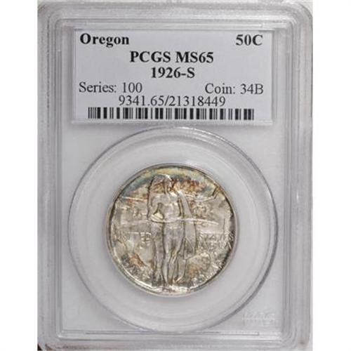 <B>1926-S 50C Oregon MS65 PCGS.</B></I> PCGS Population (853/414). NGC Census: (815/653). Mintage: 83,055. Numismedia Wsl. Price for NGC/PCGS coin in MS65: $268. (#9341)<BR><BR><b>Shipping:</b> Coins & Currency (<a target="_blank" href="http://www.heritageauctions.com/common/shipping.php">view shipping information</a>)