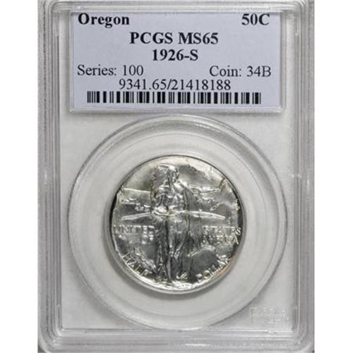 <B>1926-S 50C Oregon MS65 PCGS.</B></I> PCGS Population (856/423). NGC Census: (823/658). Mintage: 83,055. Numismedia Wsl. Price for NGC/PCGS coin in MS65: $268. (#9341)<BR><BR><b>Shipping:</b> Coins & Currency (<a target="_blank" href="http://www.heritageauctions.com/common/shipping.php">view shipping information</a>)