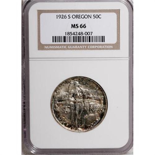 <B>1926-S 50C Oregon MS66 NGC.</B></I> NGC Census: (504/133). PCGS Population (313/91). Mintage: 83,055. Numismedia Wsl. Price for NGC/PCGS coin in MS66: $424. (#9341)<BR><I>From The Frank DuVall Collection of U.S. Commemoratives.</B></I><BR><BR><b>Shipping:</b> Coins & Currency (<a target="_blank" href="http://www.heritageauctions.com/common/shipping.php">view shipping information</a>\)