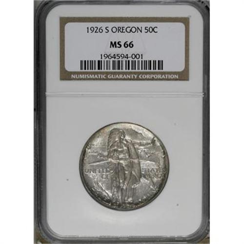 <B>1926-S 50C Oregon MS66 NGC.</B></I> NGC Census: (520/137). PCGS Population (327/96). Mintage: 83,055. Numismedia Wsl. Price for NGC/PCGS coin in MS66: $424. (#9341)<BR><BR><b>Shipping:</b> Coins & Currency (<a target="_blank" href="http://www.heritageauctions.com/common/shipping.php">view shipping information</a>)