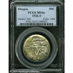 1926-S 50C Oregon MS66 PCGS. Touches of gold color <B>1926-S 50C Oregon MS66 PCGS.</B></I> Touches of gold color visit lustrous surfaces that reveal well struck design elements. There are no contact marks worthy of note. <BR><BR><B>Important notice:</B> Heritage usually auctions material at the rate of 200-250 lots per hour. On some occasions eBay Live bid software or the Internet may not be able to keep up with the pace of the auction. We recommend placing a realistic absentee bid now as insurance to avoid disappointment. Occasionally the auctioneer may eliminate or reject an eBay Live bid, and the auctioneer may also reopen a lot after the close of the eBay live bidding (usually because we missed an audience bid), and may reject your bid even if it shows you as the winning bidder. By bidding via eBay Live, you agree that Heritage may award the lot to another bidder at its sole discretion under the circumstances described above or any other reasonable circumstances. Since eBay bids are not shown to us until we open the lot on the floor, we treat those bids just like floor bids. In most cases the floor responds before the eBay bid is presented to us, due to Internet lag time, so for consistency we have made it a policy that floor bids are always considered first over tie eBay live bids. Also please note that all Heritage lots purchased through eBay Live carry a 20% Buyer's Premium. Please make sure you read the Terms and Conditions before you bid. This lot is being auctioned in conjunction with a live floor auction by Heritage Galleries & Auctioneers. All final auction and invoice information will be supplied by Heritage Galleries & Auctioneers, and all other information should be considered preliminary. Lot:7922