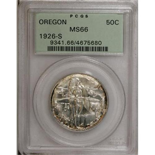 <B>1926-S 50C Oregon MS66 PCGS.</B></I> . PCGS Population (327/96). NGC Census: (521/136). Mintage: 83,055. Numismedia Wsl. Price for NGC/PCGS coin in MS66: $424. (#9341)<BR><BR><b>Shipping:</b> Coins & Currency (<a target="_blank" href="http://www.heritageauctions.com/common/shipping.php">view shipping information</a>)