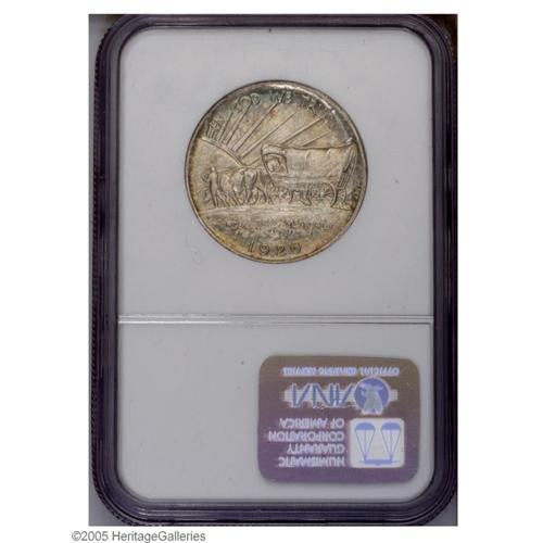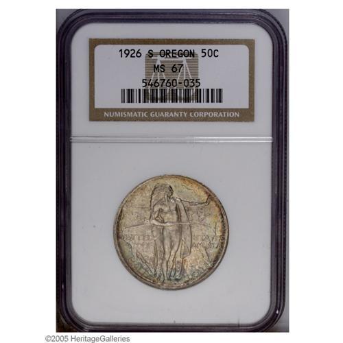 <B>1926-S<50C> Oregon MS67 NGC.</B></I> Beautifully toned in golden-brown, aquamarine, and rose-violet colors. A nicely struck and carefully preserved Superb Gem that has no shortage of eye appeal. Population: 186 in 67, 10 finer (10/05).