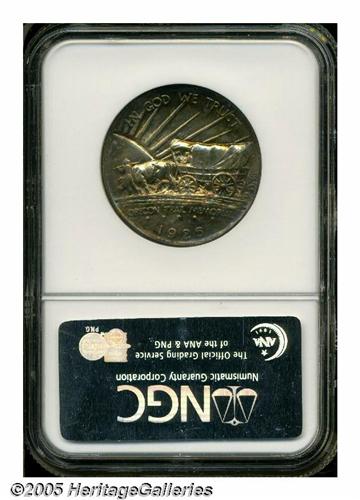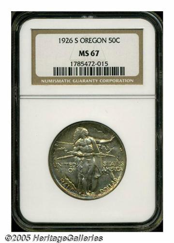 <B>1926-S<50C> Oregon MS67 NGC.</B></I> Fully struck and impeccably preserved, this visually enticing Superb Gem reveals luscious original toning on both sides, and seems nearly pristine. An excellent representative of this beautifully designed commemorative issue. Population: 101 in 67, 6 finer (5/05).