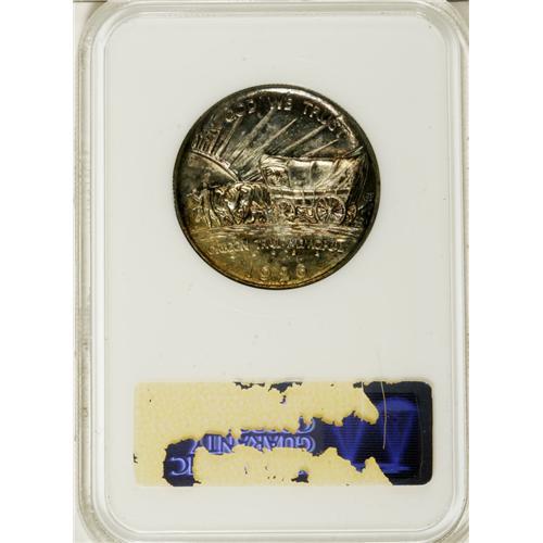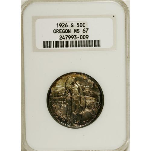 <B>1926-S 50C Oregon MS67 NGC.</B></I> Highly lustrous with solid detail and captivating plum and orange patina. On the reverse, a section of the sky remains silver-gray. NGC has graded only six coins finer (1/07).<BR><BR><b>Shipping:</b> Coins & Currency (<a target="_blank" href="http://www.heritageauctions.com/common/shipping.php">view shipping information</a>)