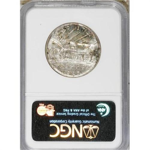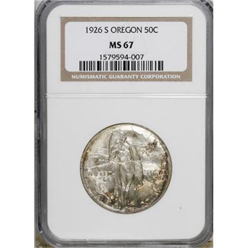 <B>1926-S 50C Oregon MS67 NGC.</B></I> Swirling, slightly satiny luster enlivens the surfaces of this boldly struck Superb Gem. Splashes of gold and claret at the margins surround pearl-gray and silver-blue centers. NGC has graded six finer pieces (1/08).<BR><BR><b>Shipping:</b> Coins & Currency (<a target="_blank" href="http://www.heritageauctions.com/common/shipping.php">view shipping information</a>)