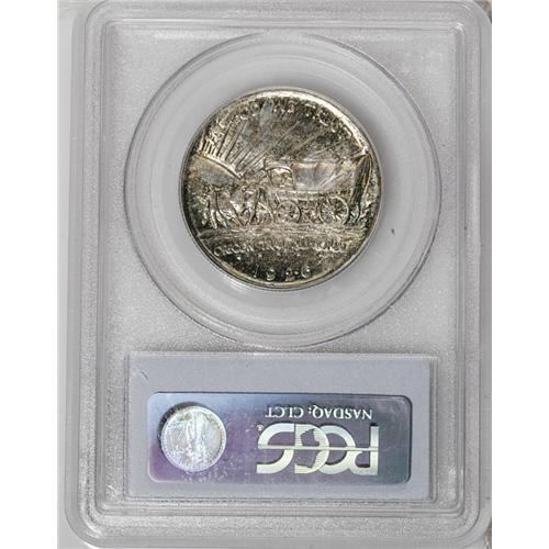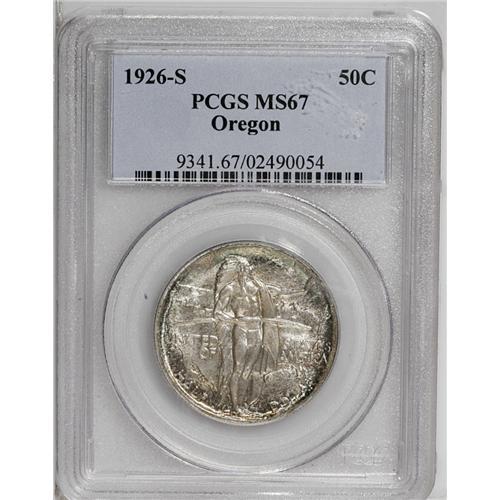 <B>1926-S<50C> Oregon MS67 PCGS.</B></I> A blazing Superb Gem of this popular issue, with mottled iridescent aqua, amber-gold, and smoke-gray toning over both sides, a bit deeper on the reverse. An especially eye-appealing piece for color aficionados.