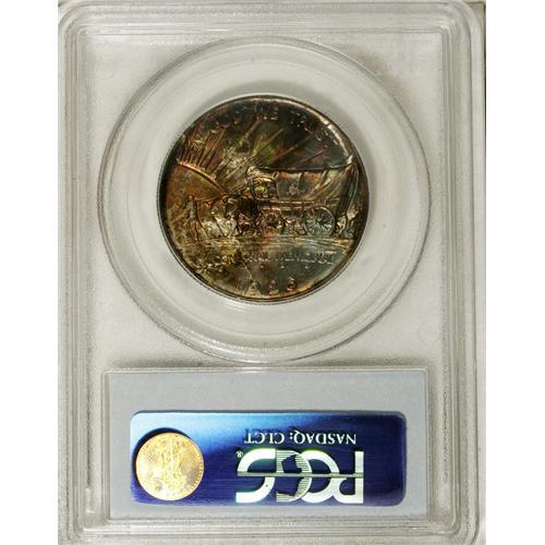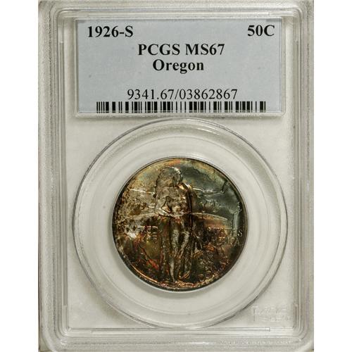<B>1926-S 50C Oregon MS67 PCGS.</B></I> After the 1926 issue sold out, the promoters of the Oregon commemoratives ordered additional pieces from the San Francisco Mint. By then, the market was saturated, and unsold remainders lingered until 1933, when the last pieces were melted. This strongly lustrous Superb Gem survivor exhibits vivid color that includes blue-green, orange-gold, ruby, and russet shades. PCGS has certified only four coins finer (4/07).<BR><I>From The Cary & Cheryl Porter Collection.</B></I><BR><BR><b>Shipping:</b> Coins & Currency (<a target="_blank" href="http://www.heritageauctions.com/common/shipping.php">view shipping information</a>)
