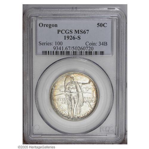 <B>1926-S<50C> Oregon MS67 PCGS.</B></I> Fabulous vibrant specimen with gold and steel-blue peripheral toning. Lustrous and mark free surfaces only add to the desirability.