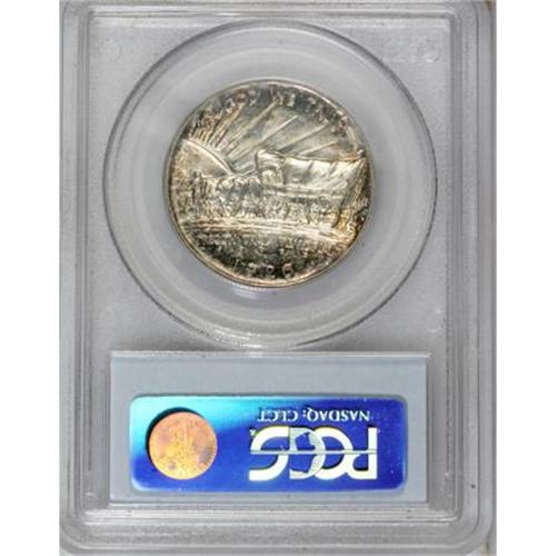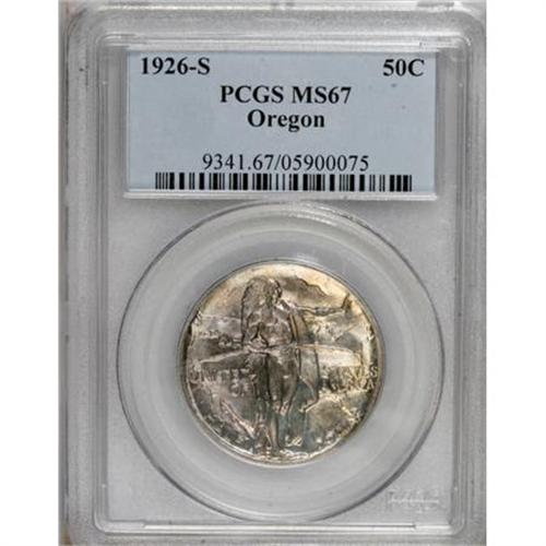 <B>1926-S 50C Oregon MS67 PCGS.</B></I> Dazzling lustrous surfaces exhibit delicate violet and gold-champagne patina on the obverse, and gold-champagne on the reverse with cobalt-blue and lavender accents at the margins. Exquisitely struck, and devoid of mentionable marks. Population: 88 in 67, 4 finer (9/07).<BR><BR><b>Shipping:</b> Coins & Currency (<a target="_blank" href="http://www.heritageauctions.com/common/shipping.php">view shipping information</a>)