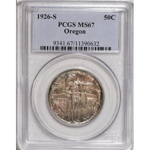 <B>1926-S 50C Oregon MS67 PCGS.</B></I> Vibrant sapphire, gold-orange, and violet shadings visit the shining surfaces of this solidly struck Superb Gem. Excellent preservation and visual appeal. PCGS has graded four finer examples (12/07).<BR><BR><b>Shipping:</b> Coins & Currency (<a target="_blank" href="http://www.heritageauctions.com/common/shipping.php">view shipping information</a>)