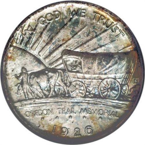<B>1926-S 50C Oregon MS68 NGC.</B></I> When this attractive half was coined, it was an example of one of only two issues in the Oregon Trail series. Still, the stage was set for the abuses that followed. Powerful luster shines beneath dappled emerald-gold, orange, and silver-gray patina on this impeccably preserved piece. NGC has graded only six examples in MS68, with just two of those receiving the Star designation (11/07).<BR><BR><b>Shipping:</b> Coins & Currency (<a target="_blank" href="http://www.heritageauctions.com/common/shipping.php">view shipping information</a>)