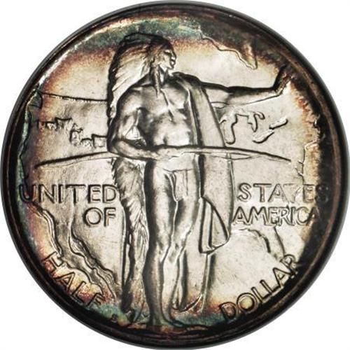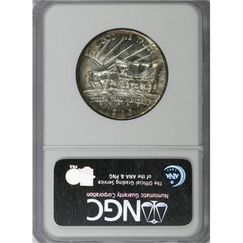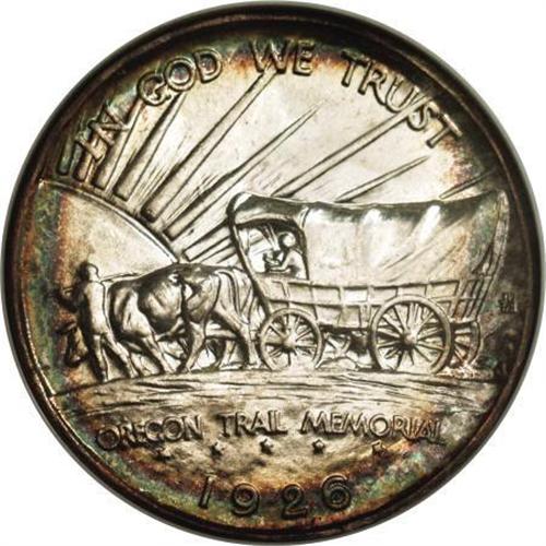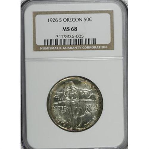 <B>1926-S 50C Oregon MS68 NGC.</B></I> Lovely powder-blue, plum-mauve, and golden-brown invigorates the margins of this lustrous Superb Gem. The strike is crisp save for the back of the wagon and the second T in STATES. A loupe is required to locate a couple of trivial abrasions. Census: 7 in 68, 0 finer (3/08).<BR><BR><b>Shipping:</b> Coins & Currency (<a target="_blank" href="http://www.heritageauctions.com/common/shipping.php">view shipping information</a>)