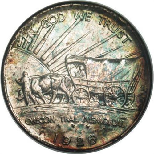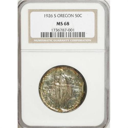 <B>1926-S 50C Oregon MS68 NGC.</B></I> When this attractive half was coined, it was an example of one of only two issues in the Oregon Trail series. Still, the stage was set for the abuses that followed. Powerful luster shines beneath dappled emerald-gold, orange, and silver-gray patina on this impeccably preserved piece. NGC has graded only seven examples in MS68 (3/08).<BR><BR><b>Shipping:</b> Coins & Currency (<a target="_blank" href="http://www.heritageauctions.com/common/shipping.php">view shipping information</a>)