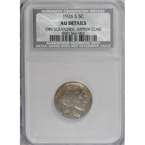 <B>1926-S 5C --Obverse Scratched, Improperly Cleaned--NCS. AU Details</B></I> The 1926-S has the lowest mintage (970,000 pieces) of any regular issue in the Buffalo nickel series. AU coins are difficult to locate, and Mint State examples are scarce to rare. Bright, lightly toned surfaces reveal a few shallow scratches on the lower obverse of this AU Details specimen. All of the design elements show good definition. The scratches are not that bad, and the cleaning was light. Interested bidders should not be intimidated by these minor flaws.<BR><BR><b>Shipping:</b> Coins & Currency (<a target="_blank" href="http://www.heritageauctions.com/common/shipping.php">view shipping information</a>)