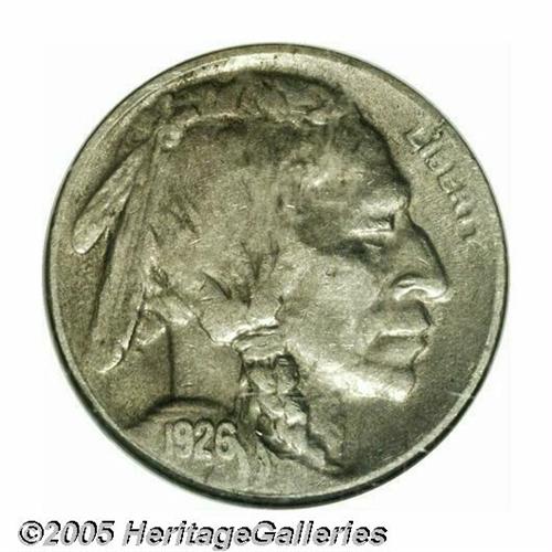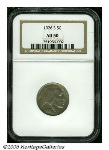 <B>1926-S<5C> AU50 NGC.</B></I> The strike on this low-mintage Buffalo issue is well above average for this often weak issue. The surfaces are smooth and essentially unmarked from the short stint in circulation. Generally light in color with a silver-gray appearance overall, a small spot of surface corrosion is noted on the F of FIVE.