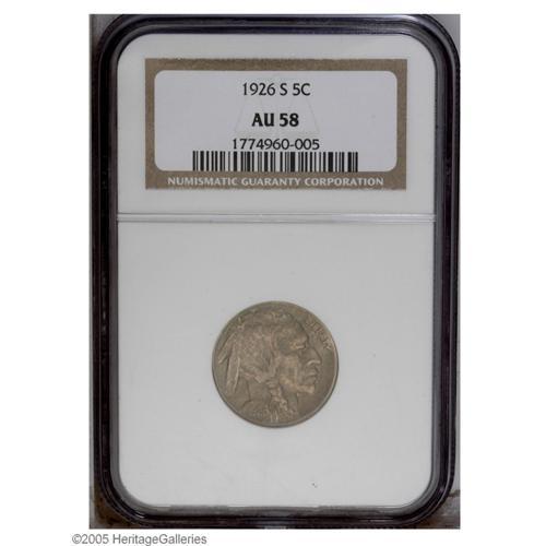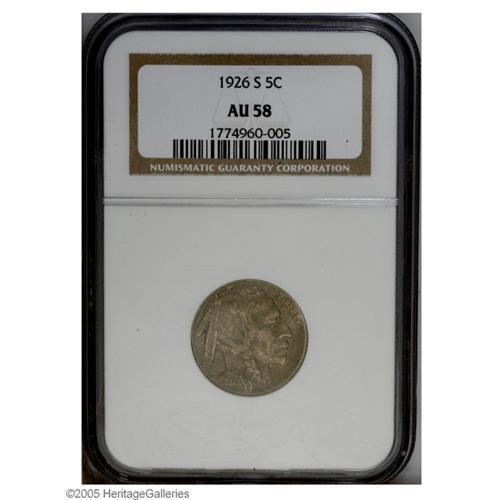 <B>1926-S<5C> AU58 NGC.</B></I> A boldly struck example of this Buffalo nickel key date, toned a pleasing reddish-gray color. Softly struck and lightly worn on the bison's head and shoulder, with muted luster and a few tiny tick marks. A nice near-Mint example of this important issue.