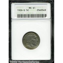 <table><tbody><tr><td><table> <TR><TD width="100%"><TABLE cellSpacing=1 cellPadding=3 width="100%" border=0><TBODY><TR><TD width="100%" bgColor=#79735c><FONT face=arial color=#ffffff size=3><B>Description</B> </FONT></TD></TR><TR><TD width="100%" bgColor=#ffffff><FONT face=arial size=2><B>1926-S 5C MS61 ANACS.</B></I> A mintage of only 970,000 pieces makes the 1926-S the scarcest regular issue Buffalo nickel. It is also worth a large premium in all grades with Mint State examples being especially elusive. The mint frost on this piece is especially noteworthy, and is suggestive of an even higher graded coin based on that element alone. Weakly struck in the center of the obverse, the reverse shows remarkably strong definition. The ice-blue centers are surrounded by golden toning at the margins. </FONT></TD></TR></TBODY></TABLE></TD></TR></TBODY></TABLE><BR><A name=PricesRealized></A><TABLE cellSpacing=0 cellPadding=0 width="100%" bgColor=#000000 border=0><TBODY><TR><TD width="100%"><TABLE cellSpacing=1 cellPadding=3 width="100%" border=0><TBODY><TR><TD width="100%" bgColor=#79735c><A name=PR><FONT face=arial color=#ffffff size=3><B>Previous Prices from Heritage Auctions</B> </FONT></A></TD></TR><TR><TD bgColor=#f6f6ed>No Prior Data Recorded </TD></TR><TR><TD bgColor=#ffffff><FONT face=arial size=1 ?>PLEASE NOTE: All prices realized reflect the final hammer price PLUS the buyer's premium in auctions that charge a buyer's premium. Each item has a notation at the top of the listing indicating whether that lot included a buyer's premium. Example: A item that sells with a final hammer price of $100 and a 20% buyer's premium will display with a price realized of $120. All information listed is intended to be as accurate as possible, but errors are possible. Please use this guide carefully and inform us of any inaccuracies. </FONT></TD></TR></TBODY></TABLE></TD></TR></TBODY></TABLE><BR><TABLE cellSpacing=0 cellPadding=0 width="100%" bgColor=#000000 border=0><TBODY><TR><TD width="100%"><TABLE cellSpacing=1 cellPadding=3 width="100%" border=0><TBODY><TR><TD width="100%" bgColor=#79735c colSpan=6><FONT face=arial color=#ffffff size=3><B>Price Guide*</B> </FONT></TD></TR><TR bgColor=#f6f6ed><TD align=middle><B>Grade</B> </TD><TD align=middle><B>Coin World<BR>(Trends)</B> </TD><TD align=middle><B>Numismedia<BR>Retail</B> </TD><TD align=middle><B>Numismedia<BR>Wholesale</B> </TD><TD align=middle><B>Coin<BR>Universe</B> </TD><TD align=middle><B>Heritage<BR>Value Index</B> </TD></TR><TR bgColor=#ffffff><TD align=middle>60</TD><TD align=right>$4,000.00</TD><TD align=right>---</TD><TD align=right>$2,750.00</TD><TD align=right>$3,200.00</TD><TD align=right>$2,685.00</TD></TR><TR style="FONT-WEIGHT: bold" bgColor=#cccfdd><TD align=middle>61</TD><TD align=right>---</TD><TD align=right>---</TD><TD align=right>$3,150.00</TD><TD align=right>---</TD><TD align=right>$3,412.78</TD></TR><TR bgColor=#ffffff><TD align=middle>62</TD><TD align=right>$5,000.00</TD><TD align=right>---</TD><TD align=right>$3,775.00</TD><TD align=right>---</TD><TD align=right>$4,140.56</TD></TR><TR bgColor=#ffffff><TD colSpan=6><FONT size=1>*All information listed is intended to be as accurate as possible, but errors are possible. No item may be returned or refused based on this information which is provided as a service to our customers. You should contact each pricing source directly to determine the accuracy of this information. </FONT></TD></TR></TBODY></TABLE></TD></TR></TBODY></TABLE><BR><TABLE cellSpacing=0 cellPadding=0 width="100%" bgColor=#000000 border=0><TBODY><TR><TD width="100%"><TABLE cellSpacing=1 cellPadding=3 width="100%" border=0><TBODY><TR><TD width="100%" bgColor=#79735c><FONT face=arial color=#ffffff size=3><B>Population Guide</B> </FONT></TD></TR><TR bgColor=#ffffff><TD align=middle><!-- Begin Output of Population Grid--><TABLE cellSpacing=0 cellPadding=0 width="100%" border=0><TBODY><TR><TD vAlign=center><TABLE cellSpacing=0 width="100%" border=1 cellsadding="3"><TBODY><TR><TD vAlign=center><TABLE cellSpacing=0 cellPadding=3 width="100%" border=1><TBODY><TR><TD vAlign=center align=middle bgColor=#f0f1e8 colSpan=2 <CENTER><FONT face=Arial size=2><B>PCGS Pop </B></FONT><CENTER></CENTER></TD><TD vAlign=center align=middle bgColor=#f0f1e8 colSpan=2><CENTER><FONT face=Arial size=2><B>NGC Pop</B></CENTER></FONT></TD></TR><TR><TD vAlign=center><FONT face=Arial size=2>(61)</FONT> </TD><TD vAlign=center align=right><FONT face=Arial size=2>3</FONT> </TD><TD vAlign=center><FONT face=Arial size=2>(61)</FONT> </TD><TD vAlign=center align=right><FONT face=Arial size=2>4</FONT> </TD></TR><TR><TD vAlign=center><FONT face=Arial size=2>(>61)</FONT> </TD><TD vAlign=center align=right><FONT face=Arial size=2>201</FONT> </TD><TD vAlign=center><FONT face=Arial size=2>(>61)</FONT> </TD><TD vAlign=center align=right><FONT face=Arial size=2>120</FONT> </TD></TR></TBODY></TABLE></TD></TR></TBODY></TABLE></TD></TR></TBODY></TABLE><!-- End Output of Population Grid--></TD></TR></TBODY></TABLE></TD></TR></TBODY></TABLE><BR><TABLE cellSpacing=0 cellPadding=0 width="100%" bgColor=#000000 border=0><TBODY><TR> <font color='#000000'><span style='background-color: #FFFFFF'><td bgcolor='#FFFFFE'> Important notice: Heritage usually auctions material at the rate of 200-250 lots per hour. On some occasions eBay Live bid software or the Internet may not be able to keep up with the pace of the auction. We recommend placing a realistic absentee bid now as insurance to avoid disappointment. Occasionally the auctioneer may eliminate or reject an eBay Live bid, and the auctioneer may also reopen a lot after the close of the eBay live bidding (usually because we missed an audience bid), and may reject your bid even if it shows you as the winning bidder. By bidding via eBay Live, you agree that Heritage may award the lot to another bidder at its sole discretion under the circumstances described above or any other reasonable circumstances. Since eBay bids are not 