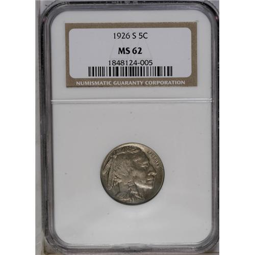 <B>1926-S<5C> MS62 NGC.</B></I> As the key issue in the series, the '26-S Buffalo nickel is in constant demand in grades from VF on up. This Mint State specimen reveals typically soft striking details, which are almost-always seen, and mild satin luster over the evenly toned rose-gray surfaces. Obviously carefully preserved, this piece is nearly blemish-free on both sides, and the few surface marks are too small to see without the aid of a magnifier. An important offering for the specialist.