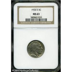 1926-S 5C MS63 NGC. Attractive traces of shimmerin <B>1926-S 5C MS63 NGC.</B></I> Attractive traces of shimmering iridescent toning highlight the even silver-gray patina seen on both sides of this attractive Nickel. The slightly soft surfaces evidence much underlying luster, unimpaired by any spotting. Overall, the low-mintage '26-S is difficult to locate in Mint State, and especially so above MS63. <BR><BR><B>Important notice:</B> Heritage usually auctions material at the rate of 200-250 lots per hour. On some occasions eBay Live bid software or the Internet may not be able to keep up with the pace of the auction. We recommend placing a realistic absentee bid now as insurance to avoid disappointment. Occasionally the auctioneer may eliminate or reject an eBay Live bid, and the auctioneer may also reopen a lot after the close of the eBay live bidding (usually because we missed an audience bid), and may reject your bid even if it shows you as the winning bidder. By bidding via eBay Live, you agree that Heritage may award the lot to another bidder at its sole discretion under the circumstances described above or any other reasonable circumstances. Since eBay bids are not shown to us until we open the lot on the floor, we treat those bids just like floor bids. In most cases the floor responds before the eBay bid is presented to us, due to Internet lag time, so for consistency we have made it a policy that floor bids are always considered first over tie eBay live bids. Also please note that all Heritage lots purchased through eBay Live carry a 20% Buyer's Premium. Please make sure you read the Terms and Conditions before you bid. This lot is being auctioned in conjunction with a live floor auction by Heritage Galleries & Auctioneers. All final auction and invoice information will be supplied by Heritage Galleries & Auctioneers, and all other information should be considered preliminary. Lot:5595