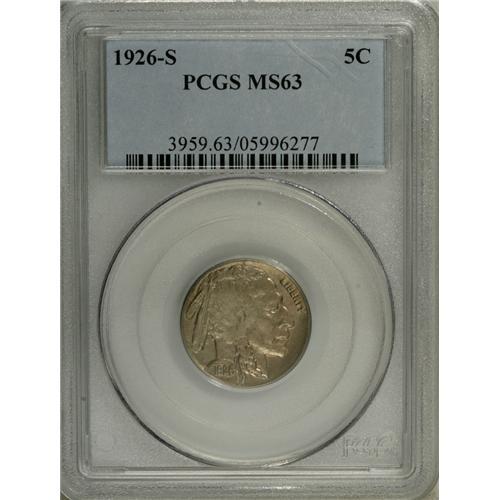 <B>1926-S 5C MS63 PCGS.</B></I> This satiny example exhibits smooth, nearly mark-free surfaces, with typical cream-gray color that is imbued with faint greenish undertones, and a few instances of faint coral-orange border toning. The design details are decently produced, with typical minor weakness noted near the obverse center and on the bison's head and shoulder. Long acknowledged as the key date of the business strike Buffalo nickels.<BR><BR><b>Shipping:</b> Coin/Currency (<a target="_blank" href="http://www.heritageauctions.com/common/shipping.php">view shipping information</a>)