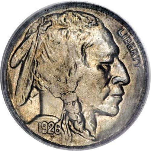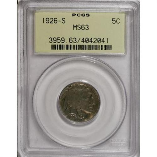 <B>1926-S 5C MS63 PCGS.</B></I> While most collectors settle for a moderately circulated example of the 1926-S nickel, lightly worn and Mint State examples are available for a price. When examining such better-condition pieces, eye appeal assumes paramount importance, and the attractive Select piece offered here rates highly. A quality representative of this famed low-mintage issue, it is luminous with subtle green-gold patina over quicksilver luster. While the central devices on each side show the softness commonly associated with S-mint pieces of the Roaring Twenties, the overall visual appeal is strong, and the surfaces show few marks for the grade, though wispy flaws on the portrait and bison preclude a finer designation.<BR><BR><B>Coin Engraver:</B> James E. Fraser<BR><BR><b>Shipping:</b> Coins & Currency (<a target="_blank" href="http://www.heritageauctions.com/common/shipping.php">view shipping information</a>)