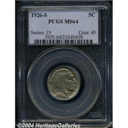 <B>1926-S<5C> MS64 PCGS.</B></I> The undisputed key to the Buffalo Nickel series, the 1926-S is a low mintage date with just 970,000 pieces produced. Mint State coins are very scarce, and Gems nearly unknown. Worn reverse dies are the norm, and the bison's head is normally weak. The example in this lot exhibits a somewhat above average strike, though portions of the Indian's hair are soft. Most of the bison reveals decent detail, and the horn is quite sharp. The peripheral elements are bold. Light gray toning is accented by crimson, gold, and pale blue toning in the fields. A few small ticks scattered about are not bothersome. <BR><BR><B>Important notice:</B> Heritage usually auctions material at the rate of 200-250 lots per hour. On some occasions eBay Live bid software or the Internet may not be able to keep up with the pace of the auction. We recommend placing a realistic absentee bid now as insurance to avoid disappointment. Occasionally the auctioneer may eliminate or reject an eBay Live bid, and the auctioneer may also reopen a lot after the close of the eBay live bidding (usually because we missed an audience bid), and may reject your bid even if it shows you as the winning bidder. By bidding via eBay Live, you agree that Heritage may award the lot to another bidder at its sole discretion under the circumstances described above or any other reasonable circumstances. Since eBay bids are not shown to us until we open the lot on the floor, we treat those bids just like floor bids. In most cases the floor responds before the eBay bid is presented to us, due to Internet lag time, so for consistency we have made it a policy that floor bids are always considered first over tie eBay live bids. Also please note that all Heritage lots purchased through eBay Live carry a 20% Buyer's Premium. Please make sure you read the Terms and Conditions before you bid. </span></font></tr></table></td></tr></table>
