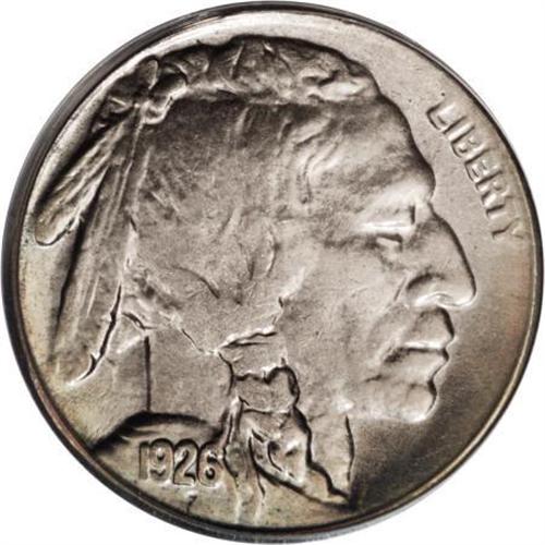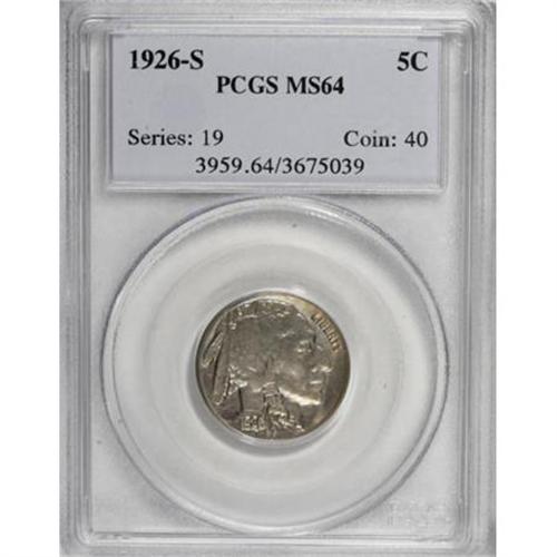 <B>1926-S 5C MS64 PCGS.</B></I> Recognized for decades as the key to the regular Buffalo nickel series, a mere 970,000 pieces were struck. This, of course, means the '26-S is scarce in all grades, and it is a notable rarity in mint condition. As a strike rarity, this issue's status is beyond comparison in the series. The coins simply did not leave the San Francisco Mint with full definition. As Lange states in his third edition: "Worn reverse dies are the norm for 1926-S. These were probably leftovers from previous years, since dateless dies could be used until they failed completely." <BR> This piece has bright mint luster with a metallic sheen, rather than the frosted finish one might expect from a San Francisco product. Better struck than many 1926-S nickels, but of course still lacking highpoint definition. Pale iridescent toning is seen over each side.<BR><BR><B>Coin Engraver:</B> James E. Fraser<BR><BR><b>Shipping:</b> Coins & Currency (<a target="_blank" href="http://www.heritageauctions.com/common/shipping.php">view shipping information</a>)
