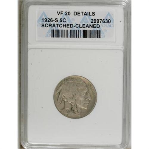 <B>1926-S 5C --Cleaned, Scratched--ANACS. VF20 Details.</B></I> NGC Census: (0/0). PCGS Population (143/688). Mintage: 970,000. Numismedia Wsl. Price for NGC/PCGS coin in VF20: $342. (#3959)<BR><BR><B>Coin Engraver:</B> James E. Fraser<BR><BR><b>Shipping:</b> Coins & Currency (<a target="_blank" href="http://www.heritageauctions.com/common/shipping.php">view shipping information</a>)
