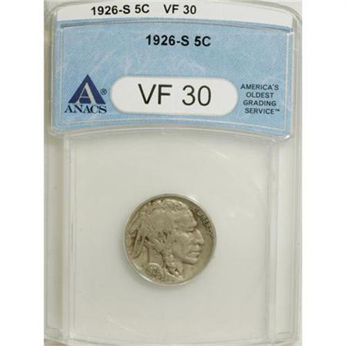 <B>1926-S 5C VF30 ANACS.</B></I> NGC Census: (94/408). PCGS Population (87/506). Mintage: 970,000. Numismedia Wsl. Price for NGC/PCGS coin in VF30: $515. (#3959)<BR><BR><b>Shipping:</b> Coins & Currency (<a target="_blank" href="http://www.heritageauctions.com/common/shipping.php">view shipping information</a>)