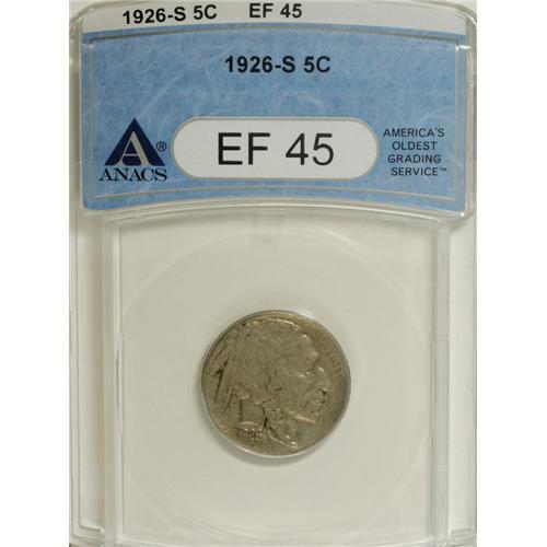 <B>1926-S 5C XF45 ANACS.</B></I> A completely problem-free full horn example of this desirable key date nickel. The only date and mintmark combination with a mintage below 1 million pieces.<BR><BR><b>Shipping:</b> Coins & Currency (<a target="_blank" href="http://www.heritageauctions.com/common/shipping.php">view shipping information</a>)