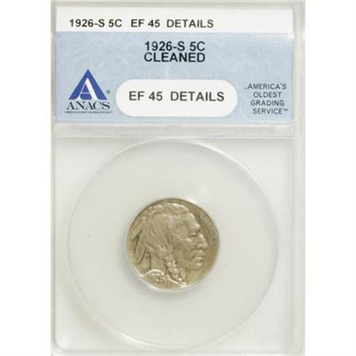 <B>1926-S 5C --Cleaned--ANACS. XF45 Details.</B></I> This lightly cleaned '26-S displays champagne-gray surfaces. Nice definition shows on the design features, except for weakness on the bison's head, which is typical for the issue. Devoid of mentionable marks or unsightly spots.<BR><BR><B>Coin Engraver:</B> James E. Fraser<BR><BR><b>Shipping:</b> Coins & Currency (<a target="_blank" href="http://www.heritageauctions.com/common/shipping.php">view shipping information</a>)