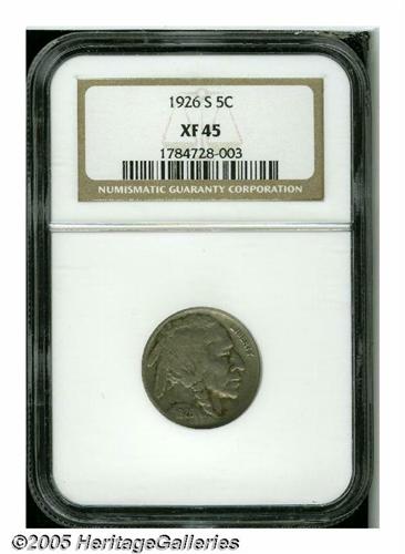 <B>1926-S<5C> XF45 NGC.</B></I> A pleasing example of this key issue to the Buffalo nickel series, which displays light to medium gray patina and nicely defined motifs. The surfaces are seemingly devoid of significant marks.